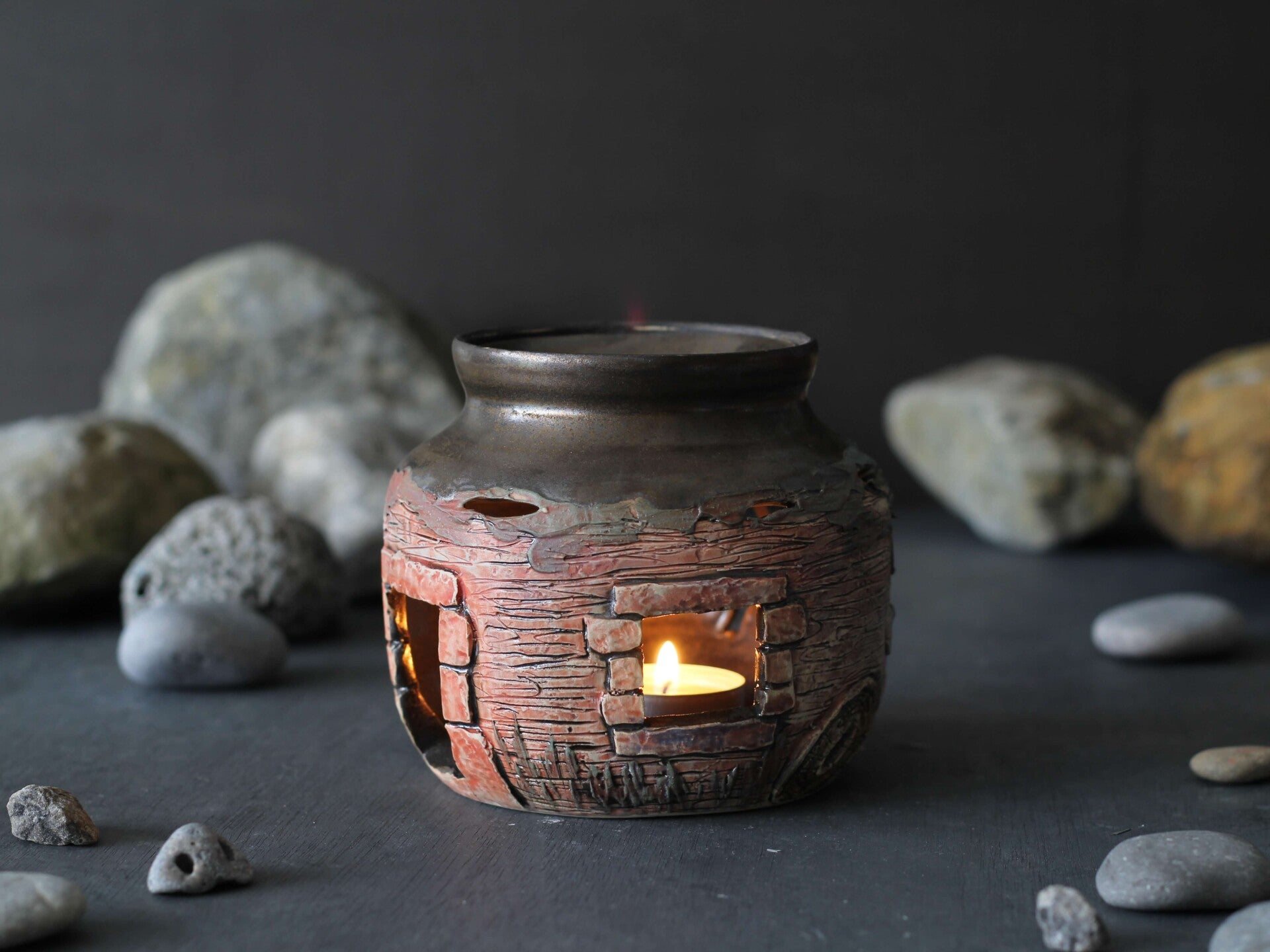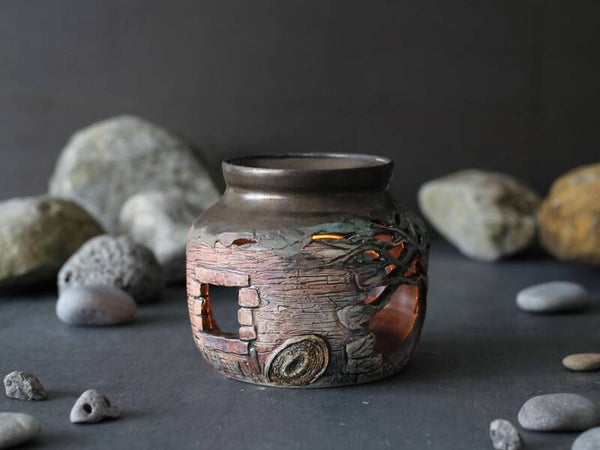 Imagine a turf fire glowing in an old traditional Irish cottage, and the cozy warmth it brings on a wild, windswept evening. This handcrafted oil burner captures that essence, designed to honor the deep connection with the old, simple way of life in rural Ireland - where harsh winds and weather shaped both landscape and soul.