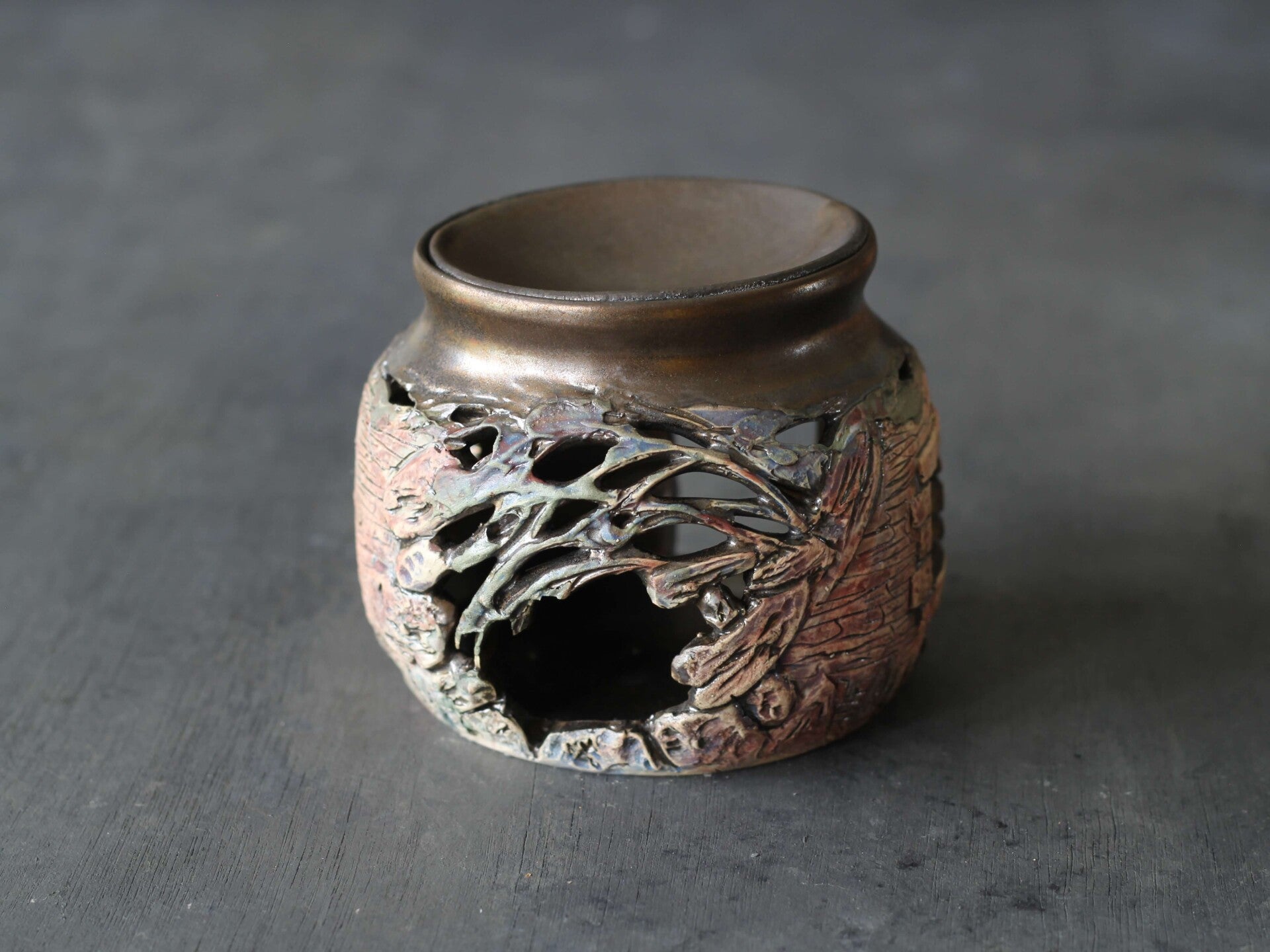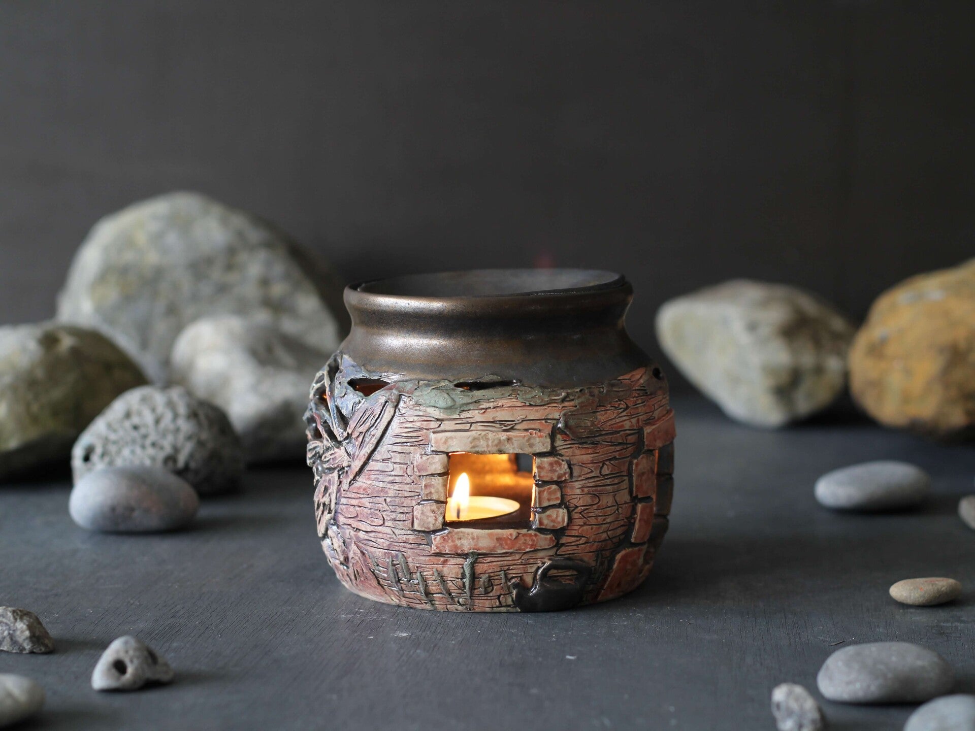 Imagine a turf fire glowing in an old traditional Irish cottage, and the cozy warmth it brings on a wild, windswept evening. This handcrafted oil burner captures that essence, designed to honor the deep connection with the old, simple way of life in rural Ireland - where harsh winds and weather shaped both landscape and soul.