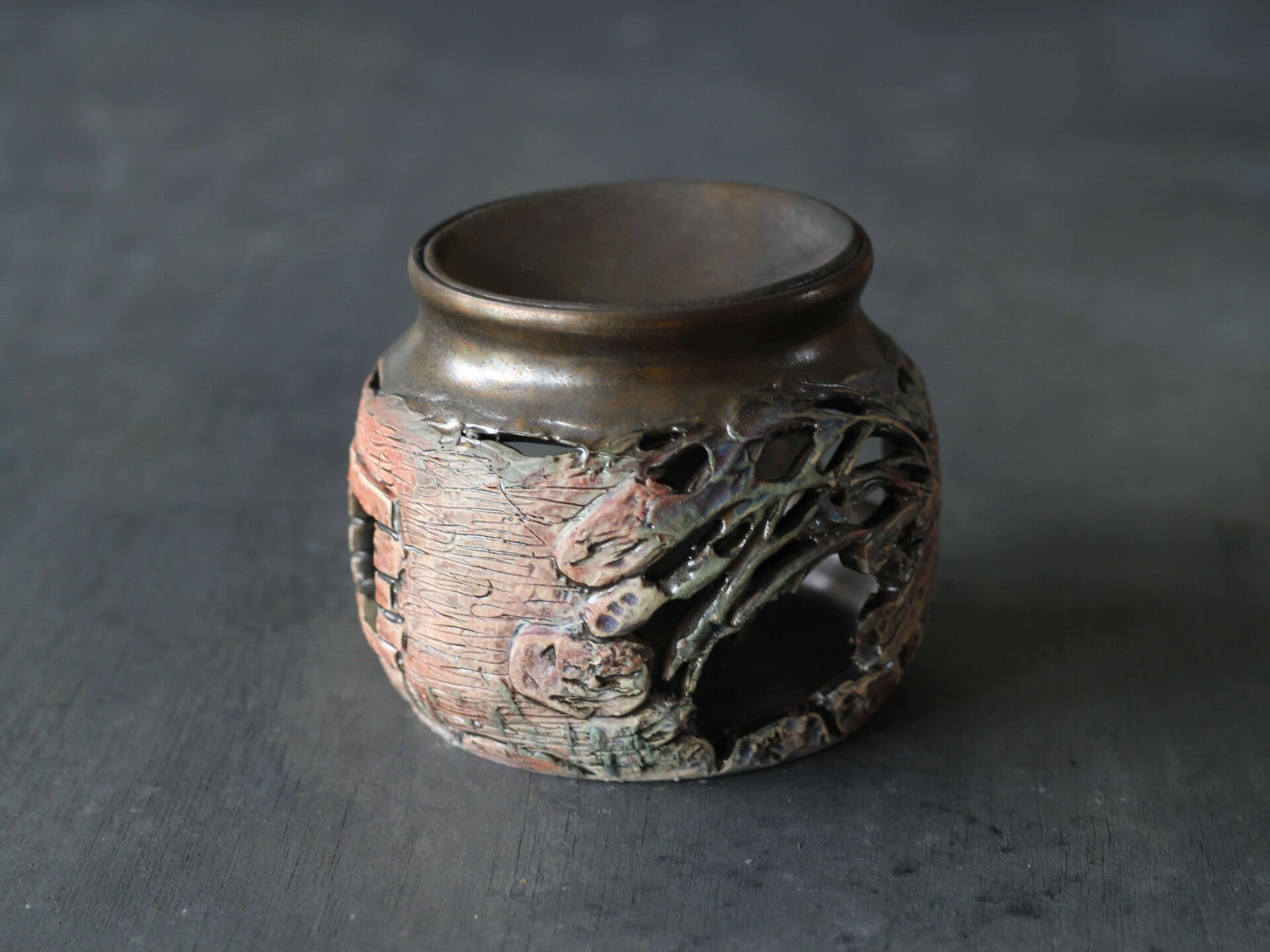 This oil burner honors the resilience of those who came before, keeping their memory alive in stone and in the deep red of protection.