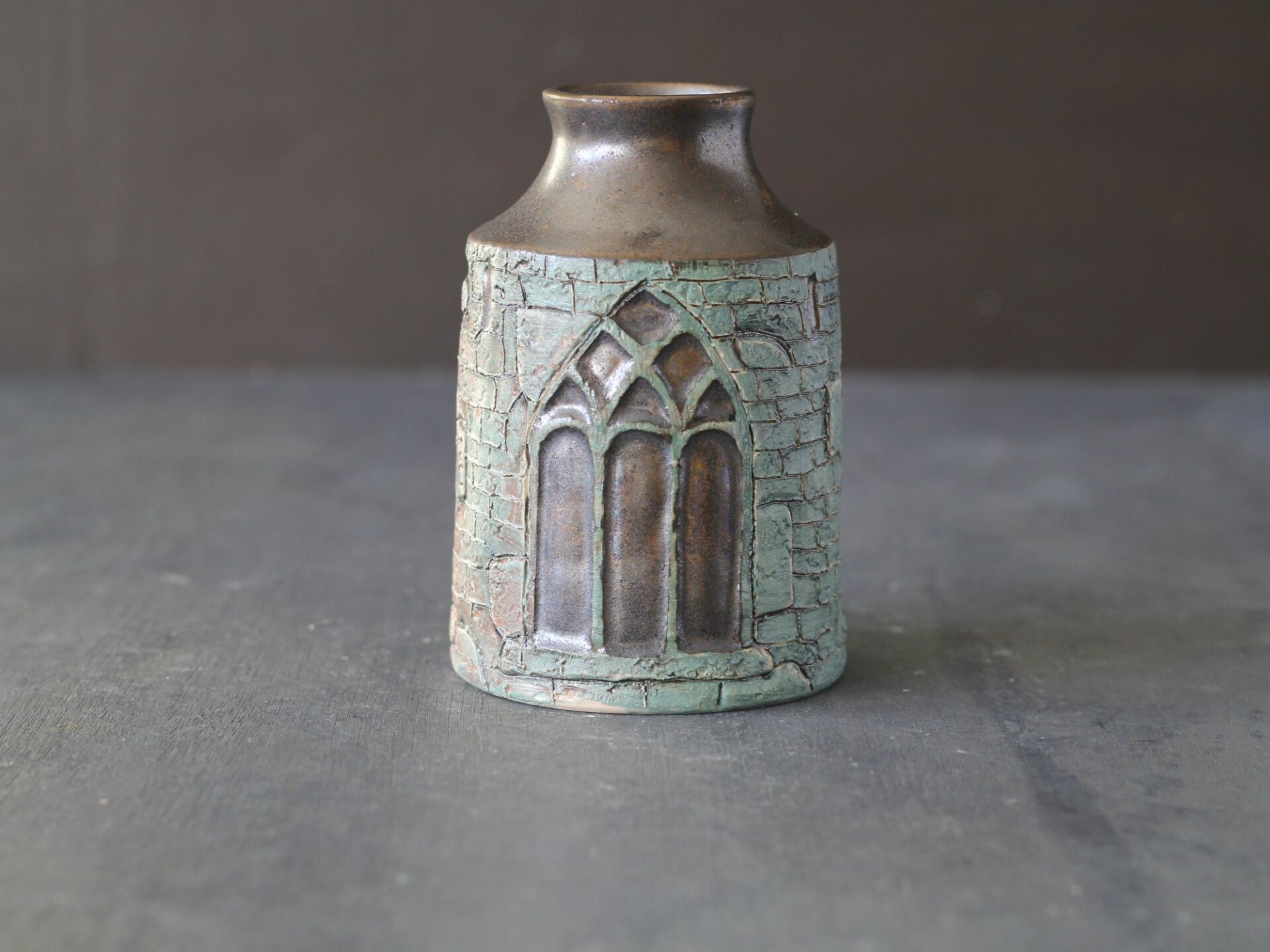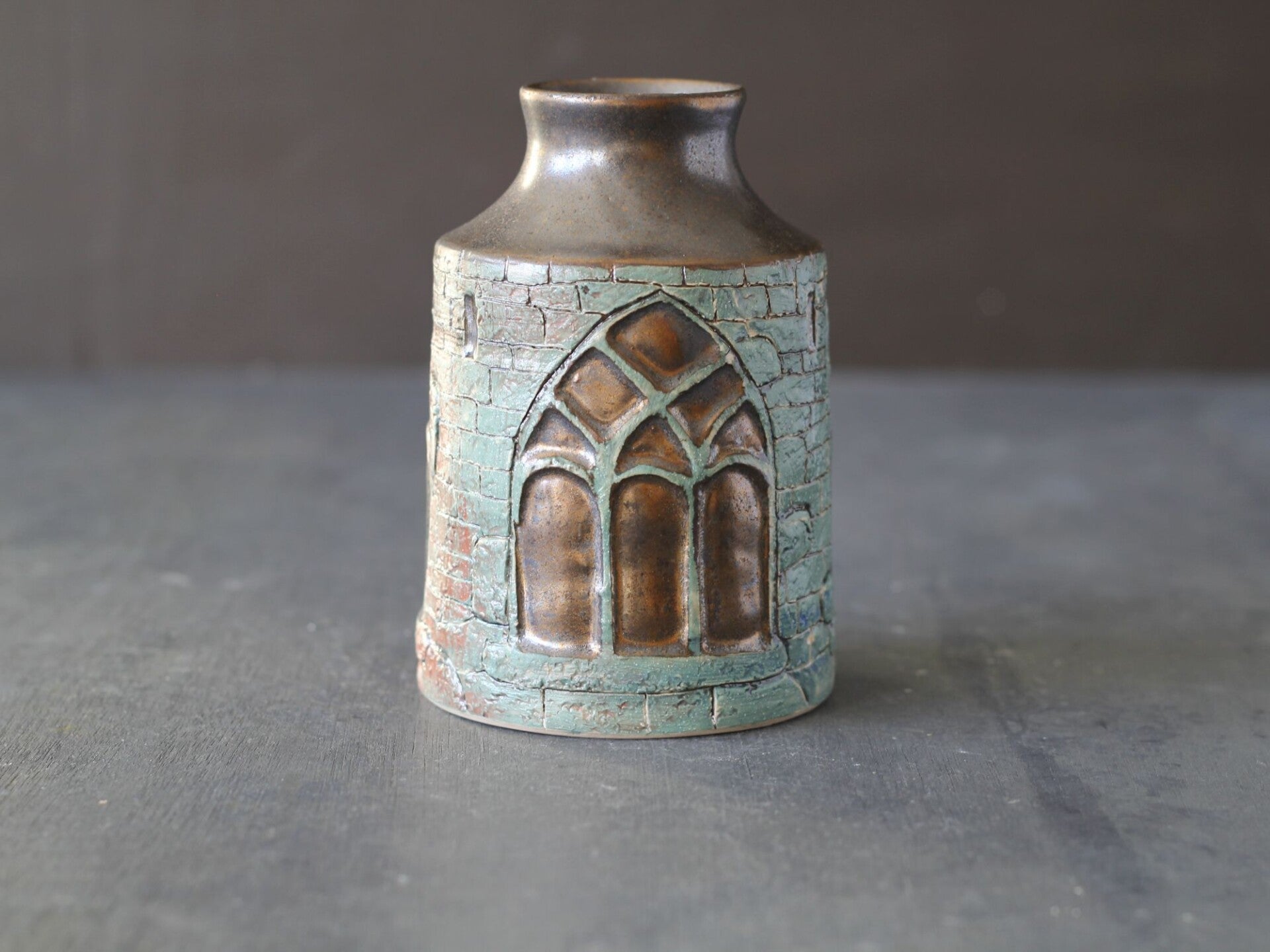 - Bronze glaze interior: Warm metallic glaze creates depth when light catches the arched openings
