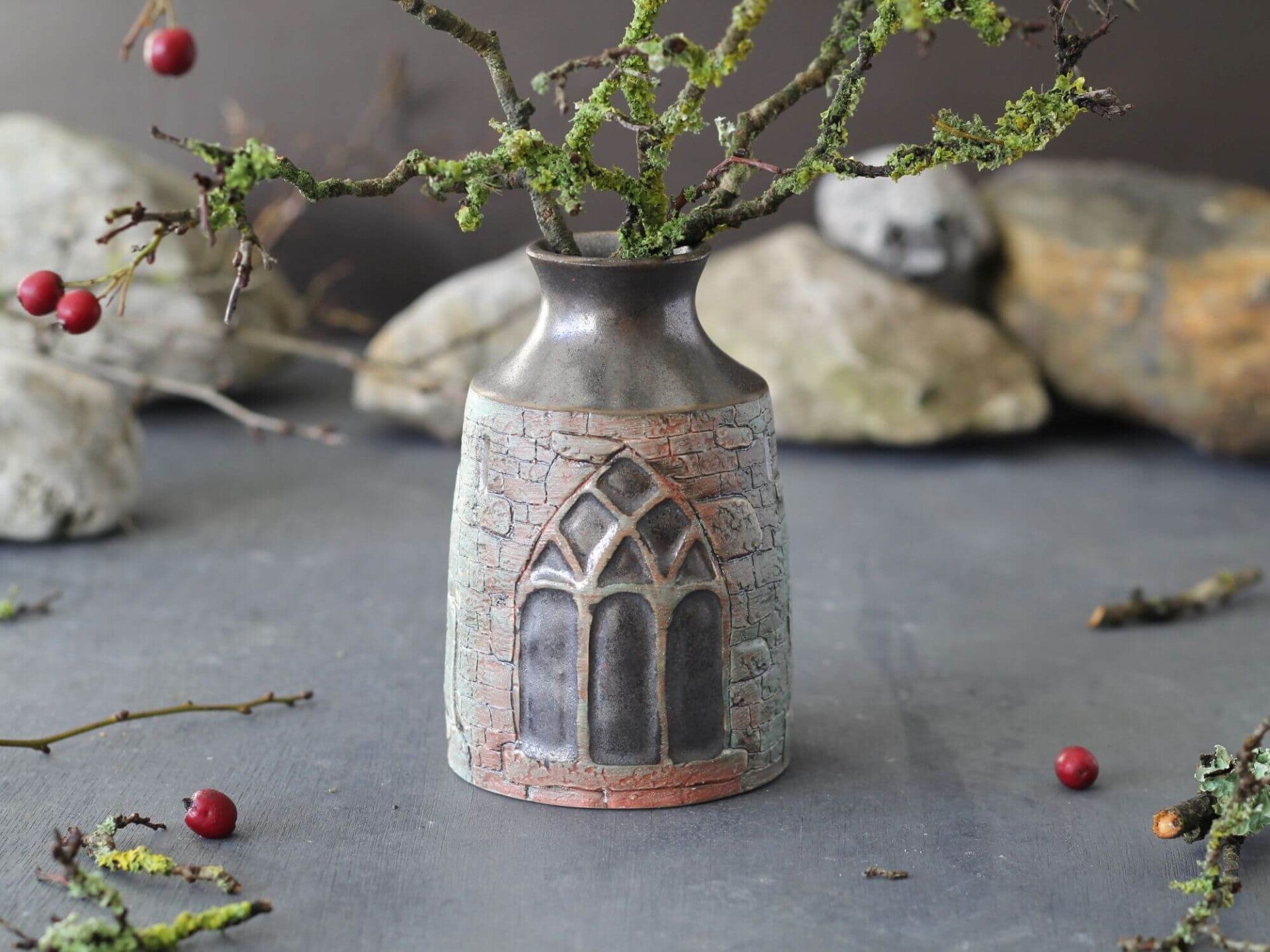 Bud vases are wonderfully versatile - a single rose, a few wildflowers, dried lavender, or even left empty as pure sculptural objects. Their smaller size makes them perfect for desks, bedside tables, windowsills, or grouped together in collections. The bottle shape is inherently elegant, and when combined with Gothic architectural details, these bud vases become miniature works of art.