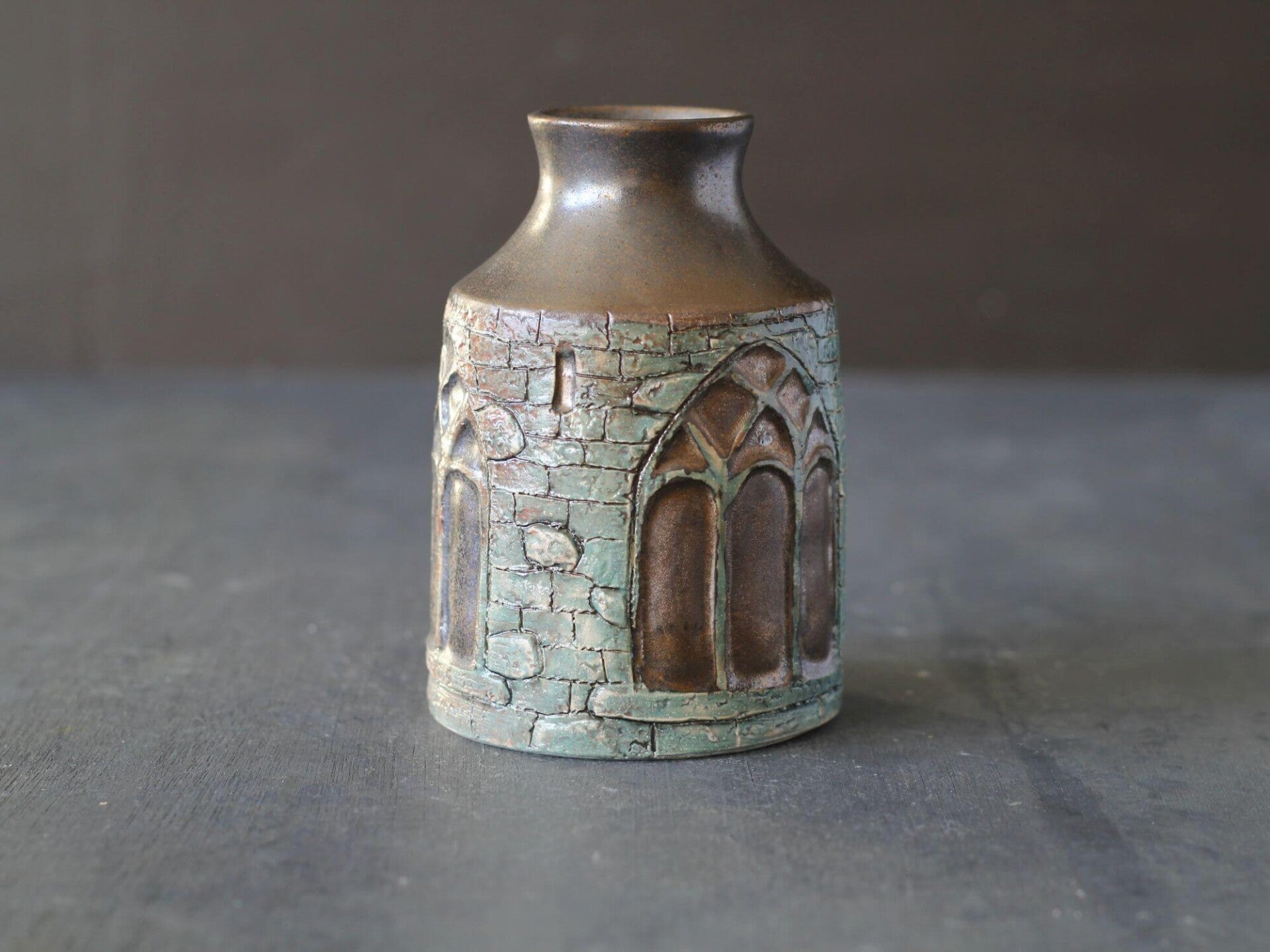 This handcrafted Irish ceramic bud vase is inspired by the Gothic architecture of Ross Errilly Friary in County Galway.