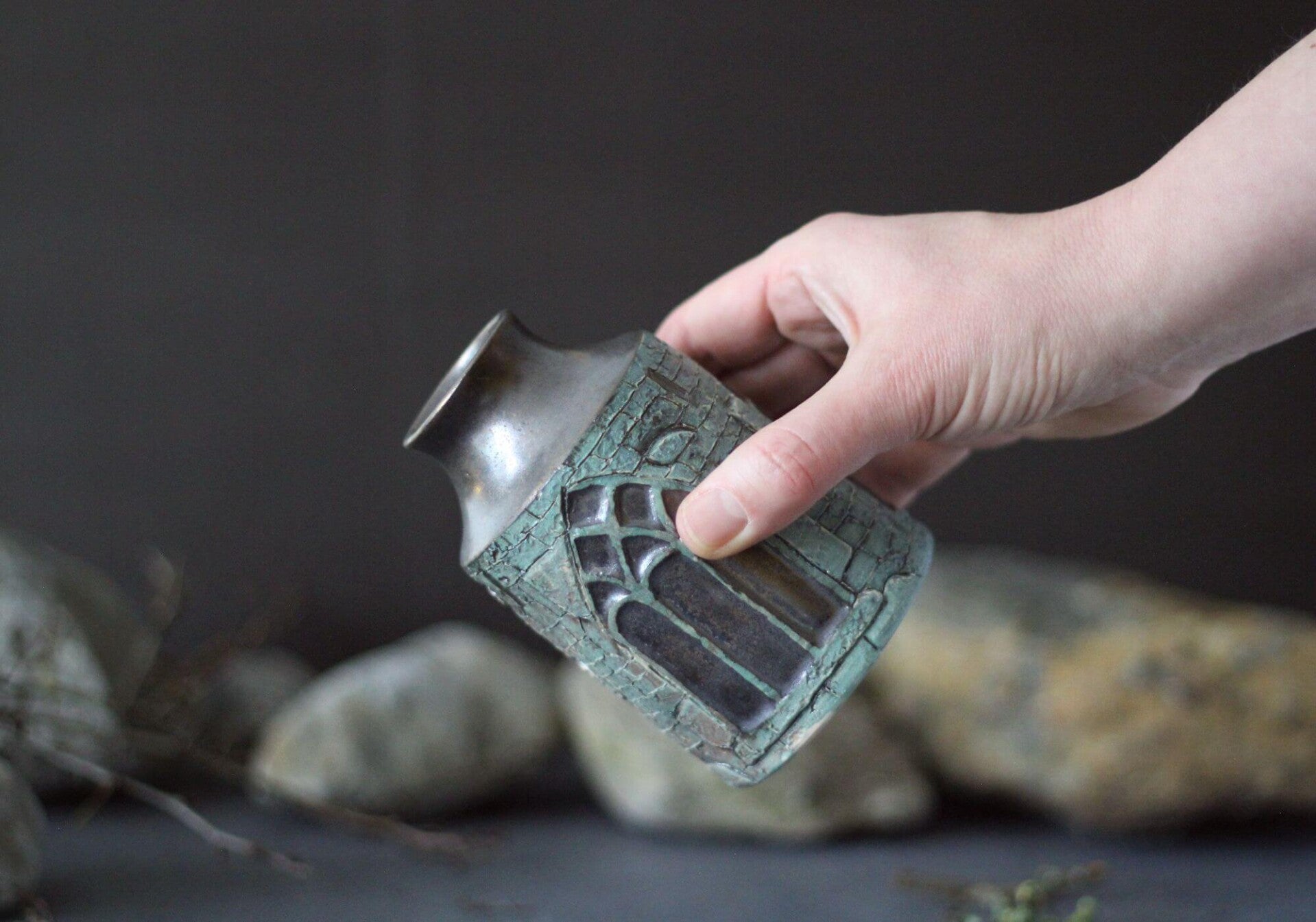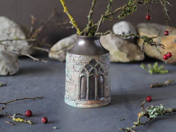 This handcrafted Irish ceramic bud vase is inspired by the Gothic architecture of Ross Errilly Friary in County Galway.